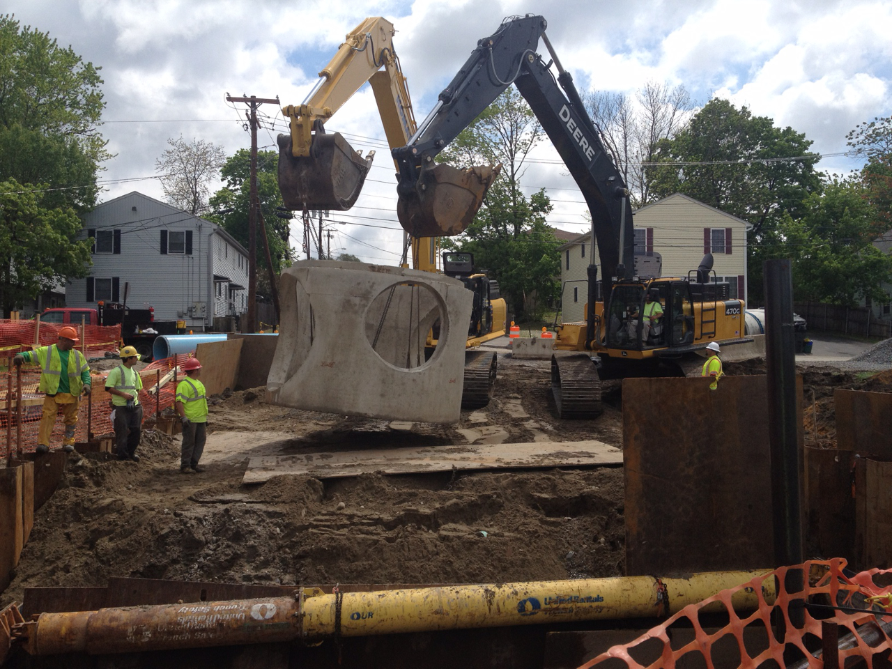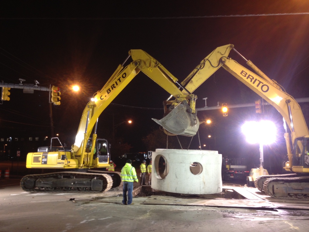 C.B. Utility installed approximately 10,000 linear feet of PVC & reinforced concrete pipe and over 180 catch basins & manholes to create a dedicated storm drainage line separate from the existing CSO. The Work also required driving of steel sheets 35-feet in length with a crane-hung hydraulic hammer, which shored a cell large enough to make connections to an existing brick 60-inch diameter main and a series of 10-foot diameter manholes.