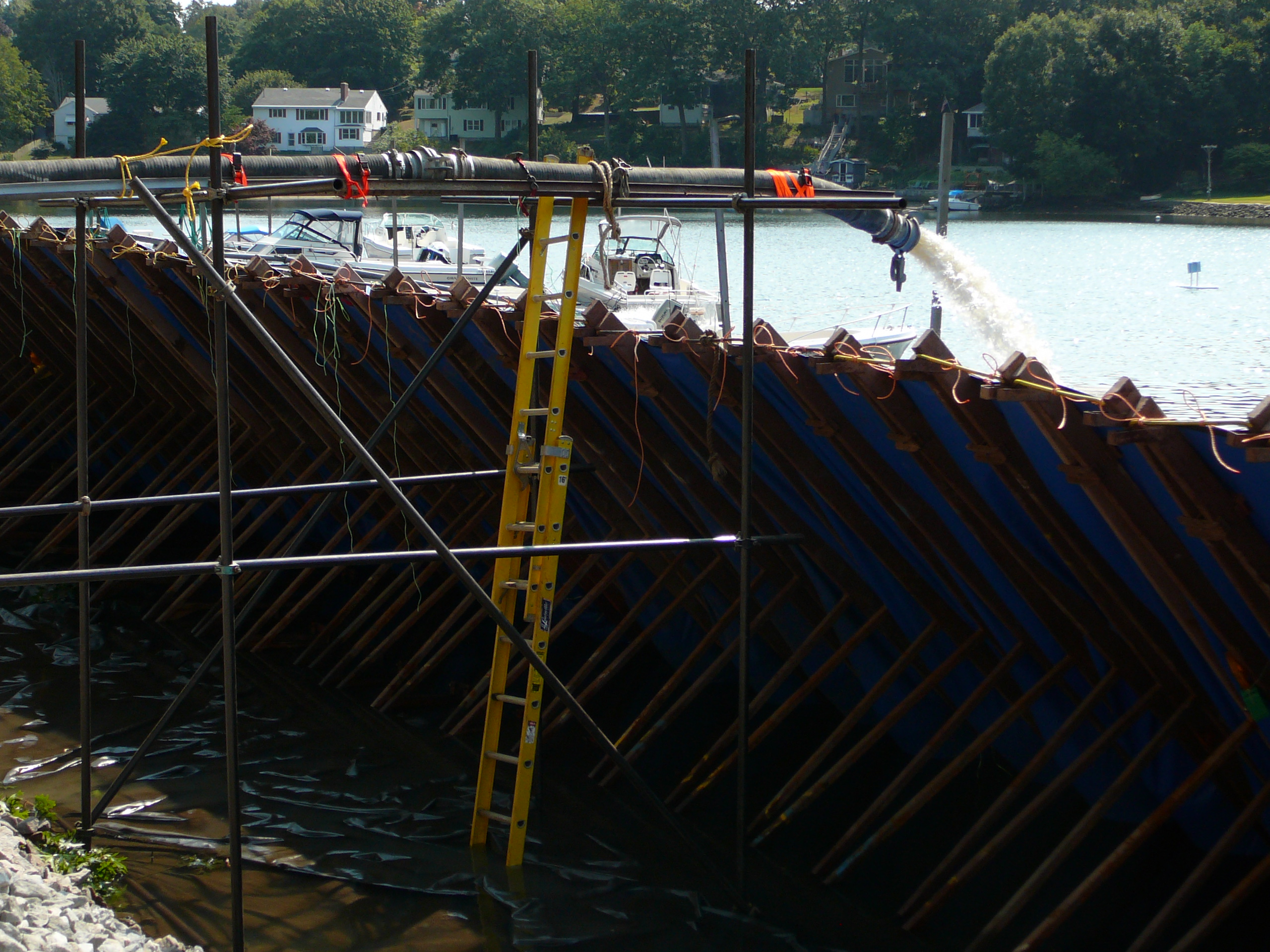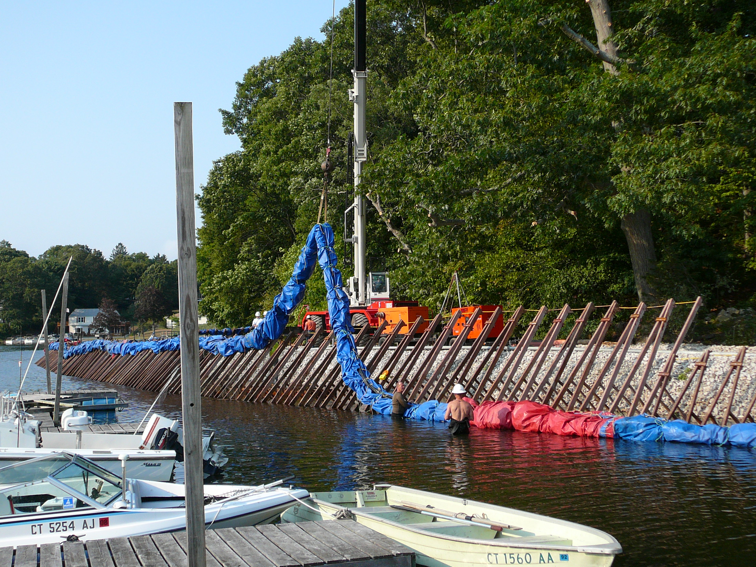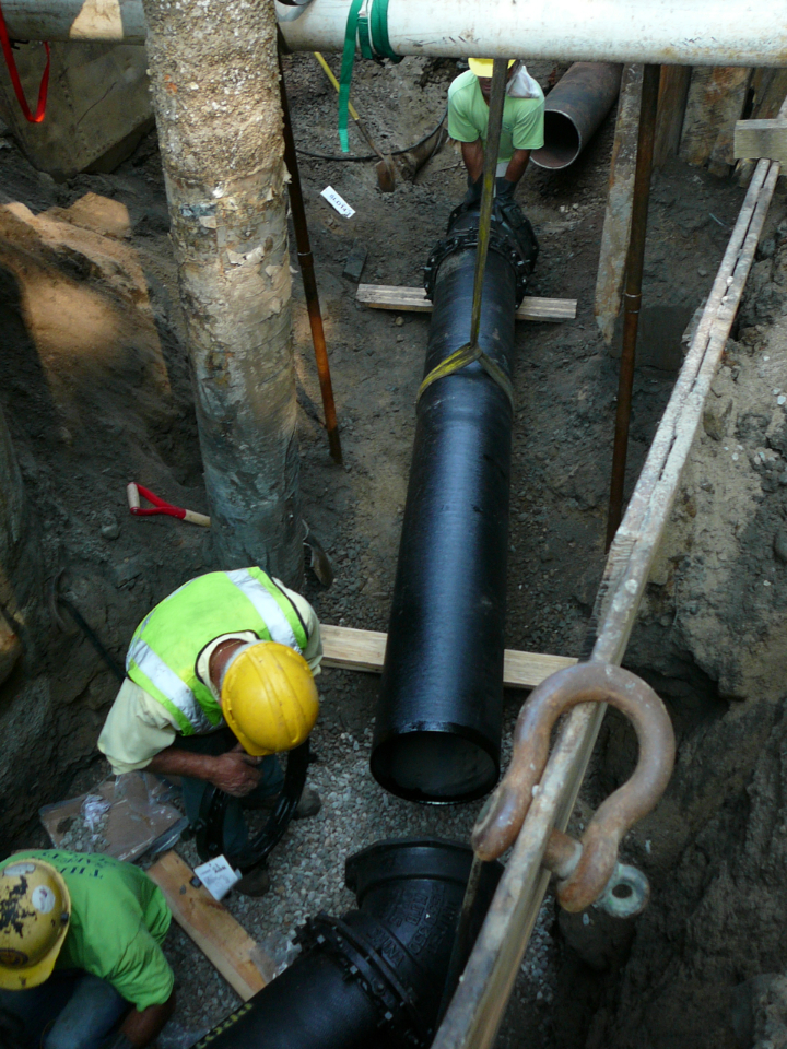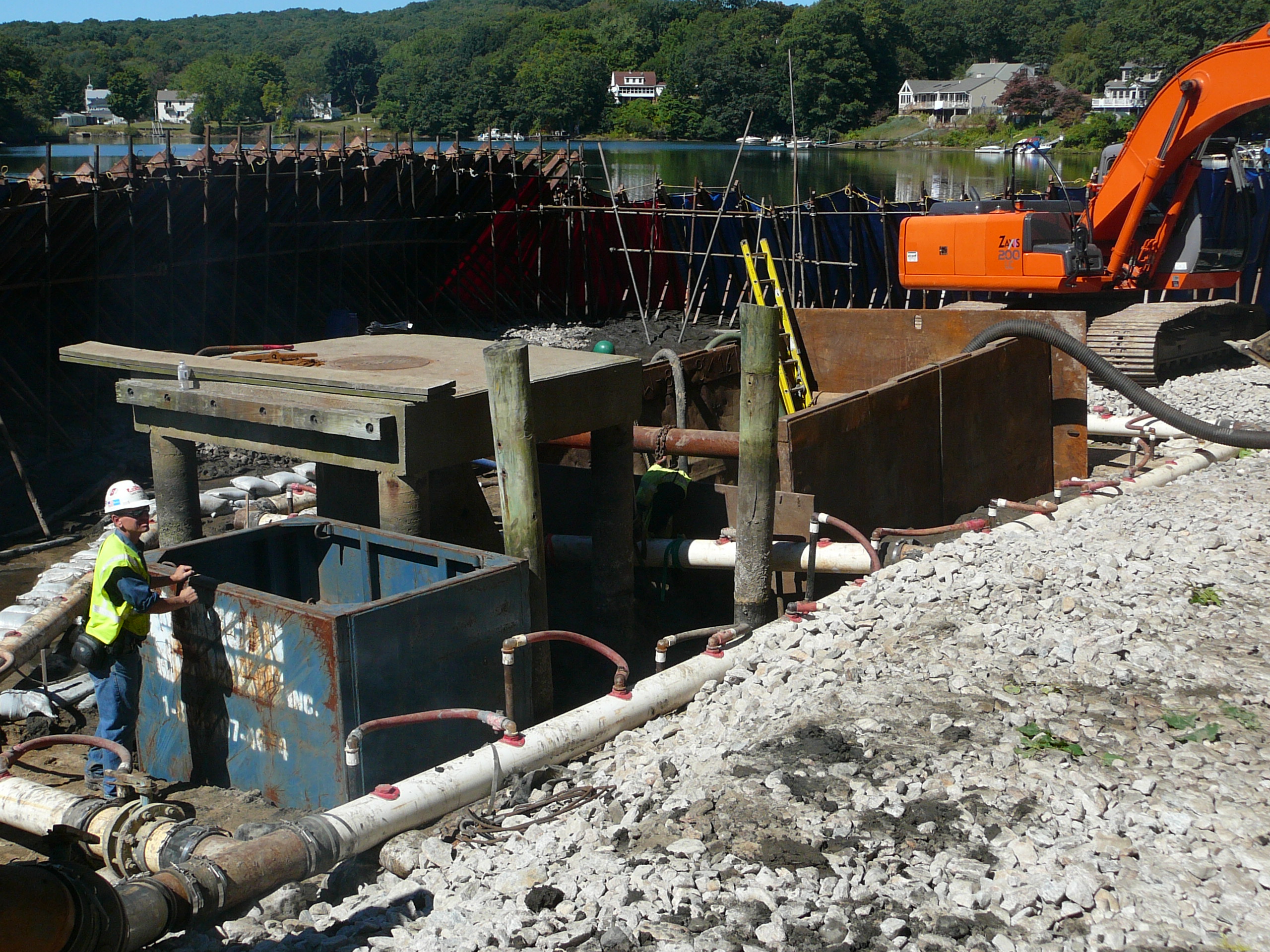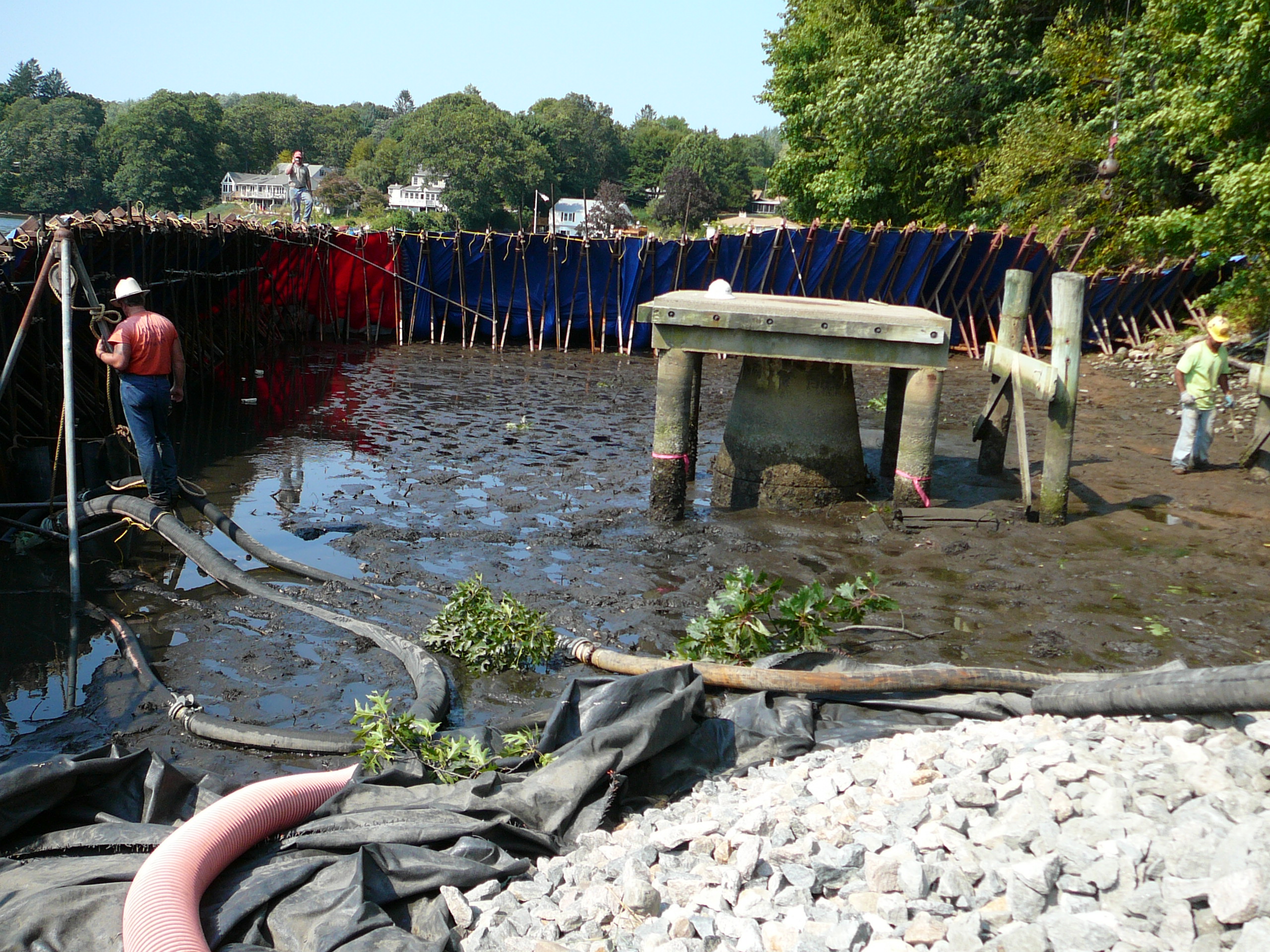 Repair of a leaking 14” cast iron sewer force main located 45’ offshore under the Smith Cove tidal basin by construction of a temporary access road composed of stone and crane mats, installation of a temporary cofferdam utilizing a rough terrain crane, and dewatering of the river utilizing 2-stage well points to access the break.