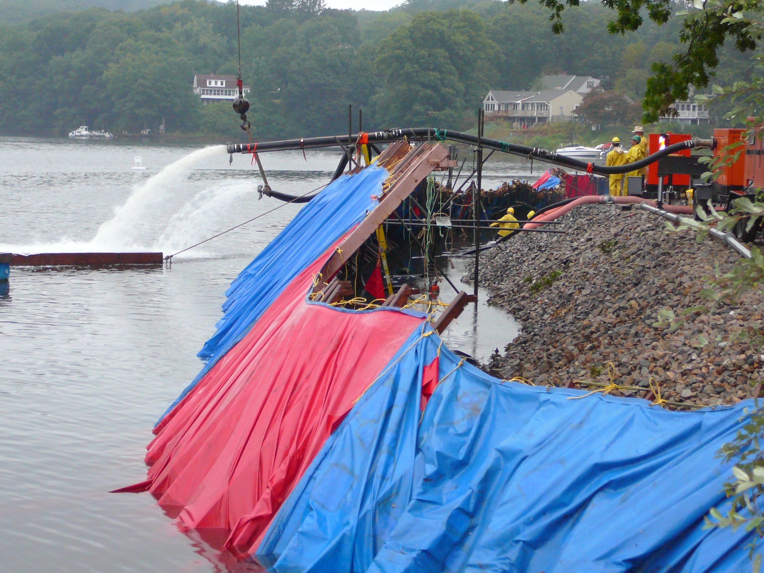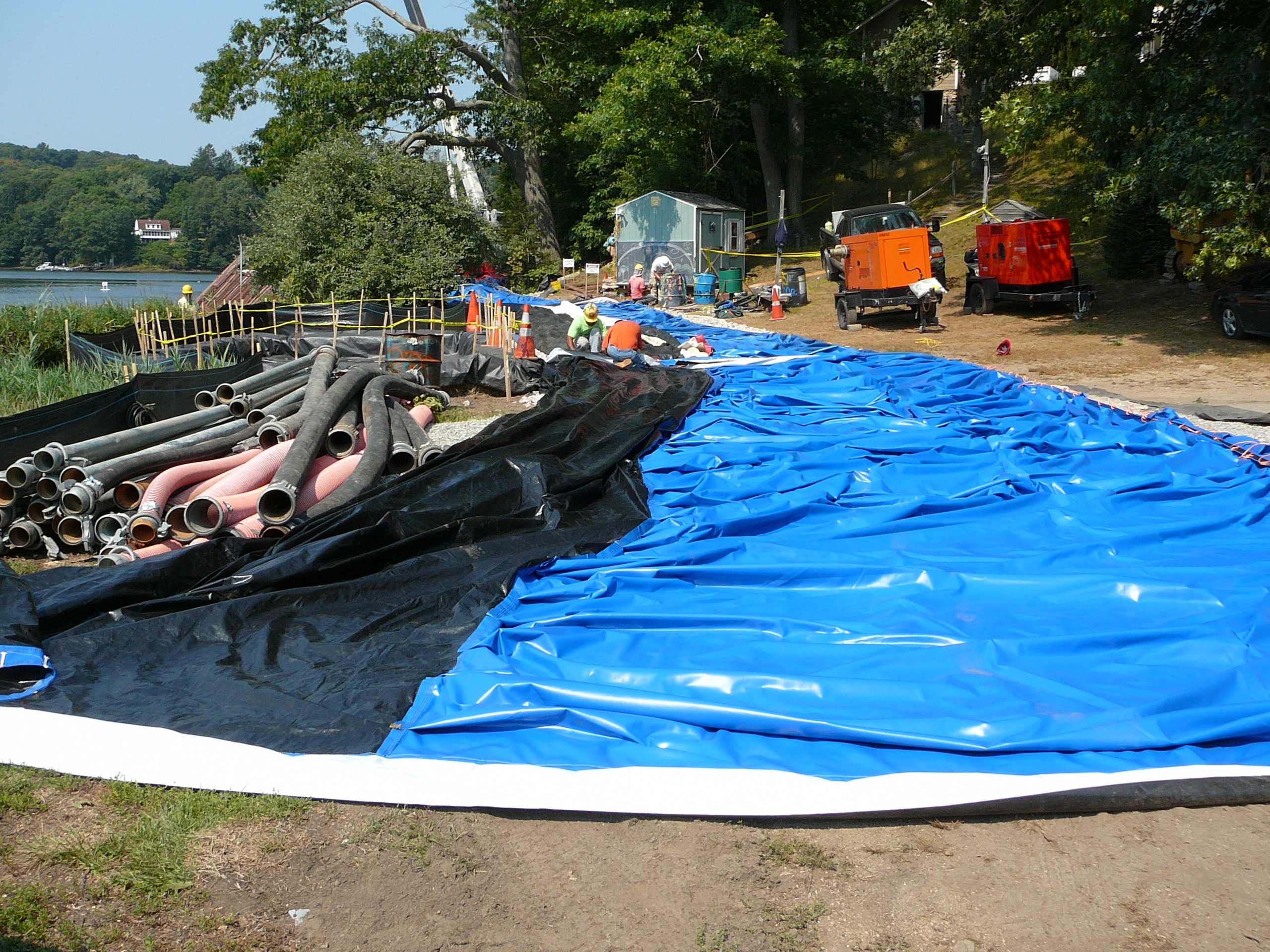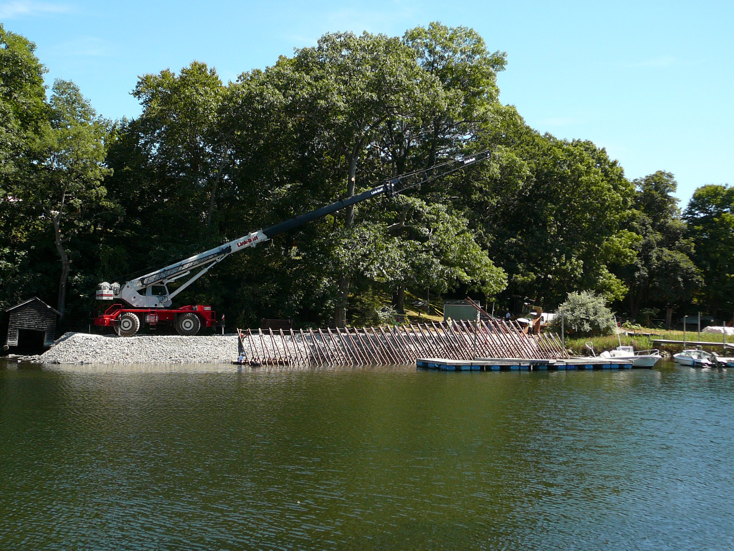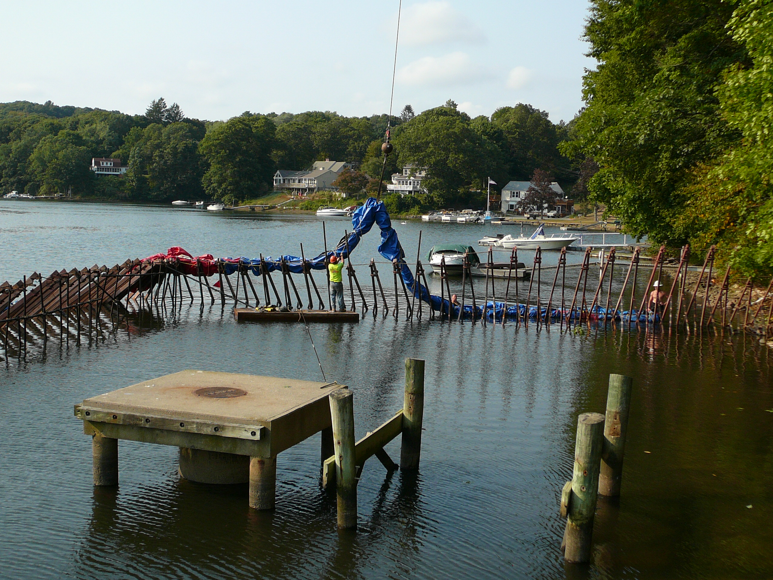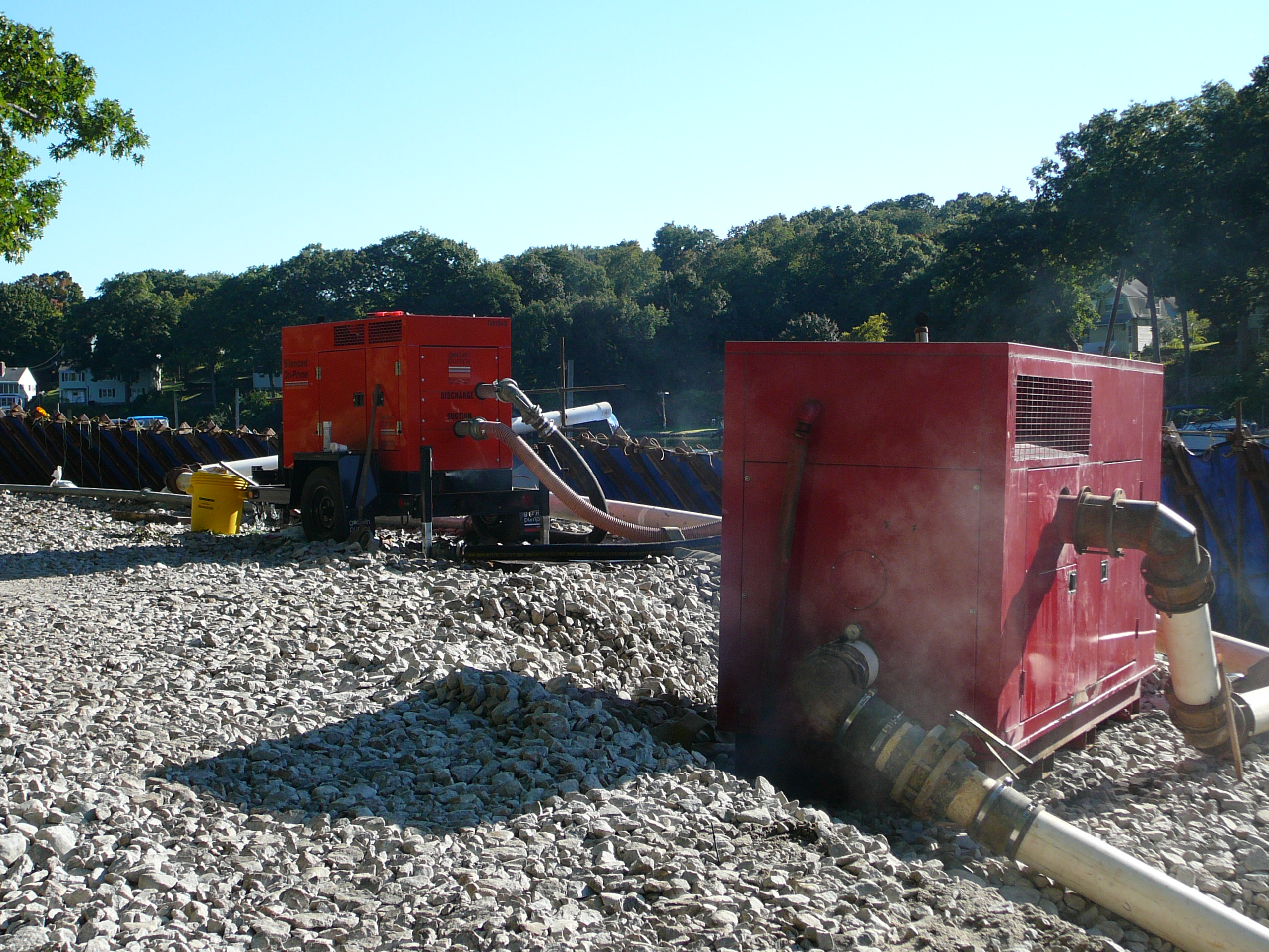 Repair of a leaking 14” cast iron sewer force main located 45’ offshore under the Smith Cove tidal basin by construction of a temporary access road composed of stone and crane mats, installation of a temporary cofferdam utilizing a rough terrain crane, and dewatering of the river utilizing 2-stage well points to access the break.