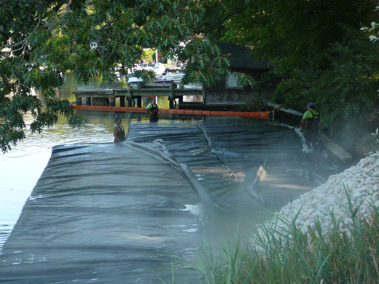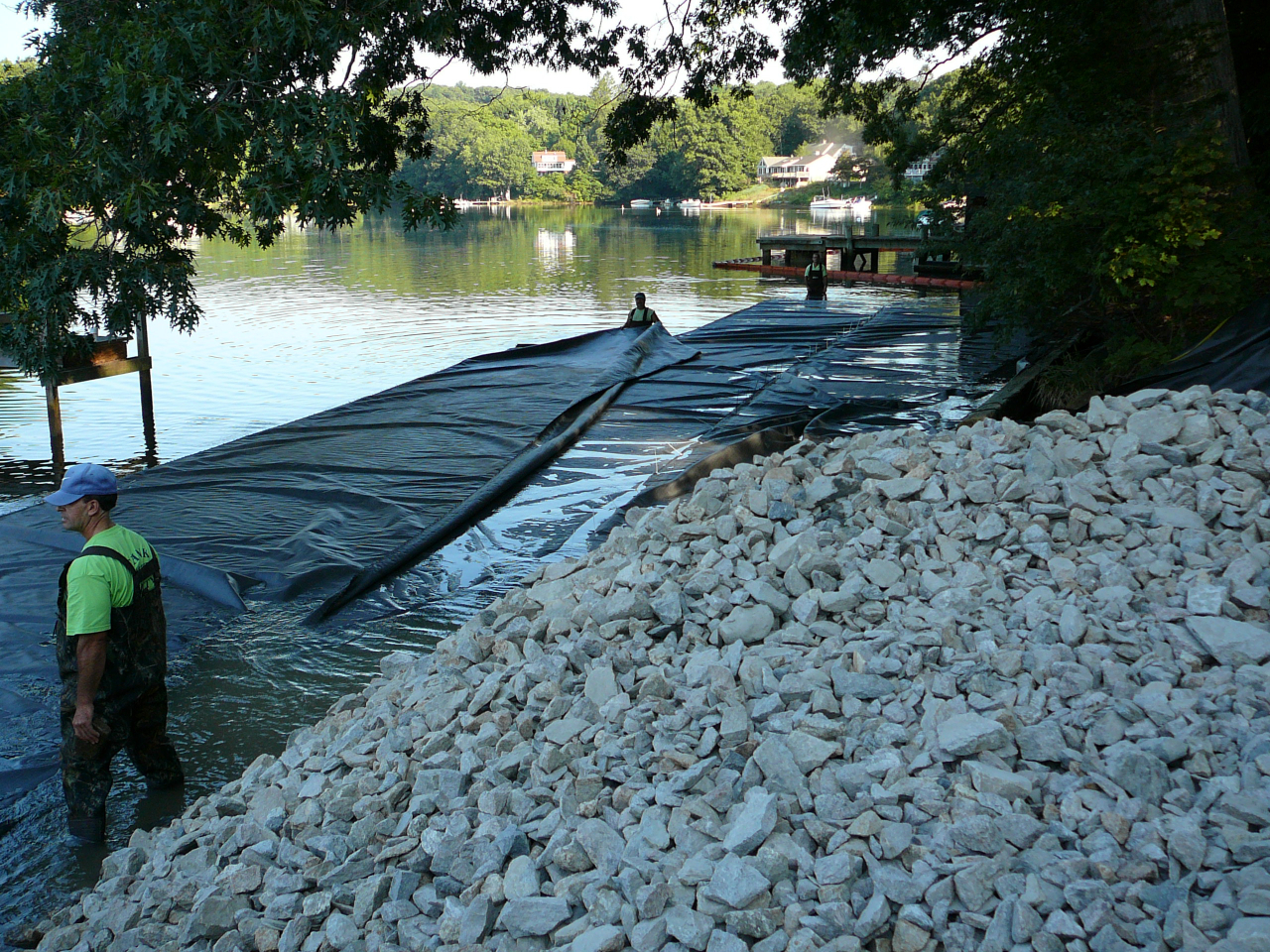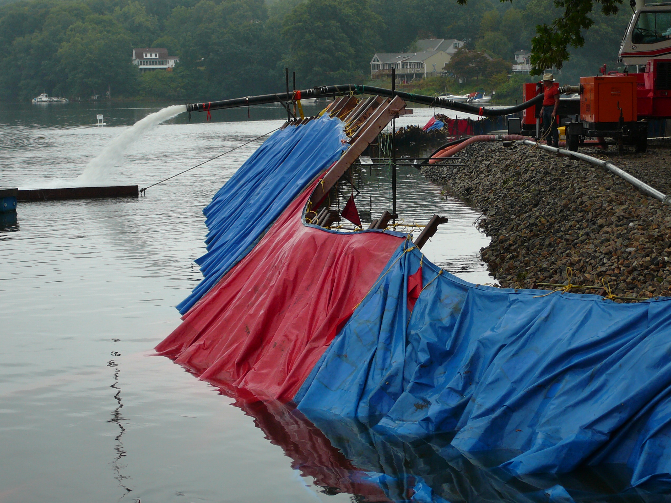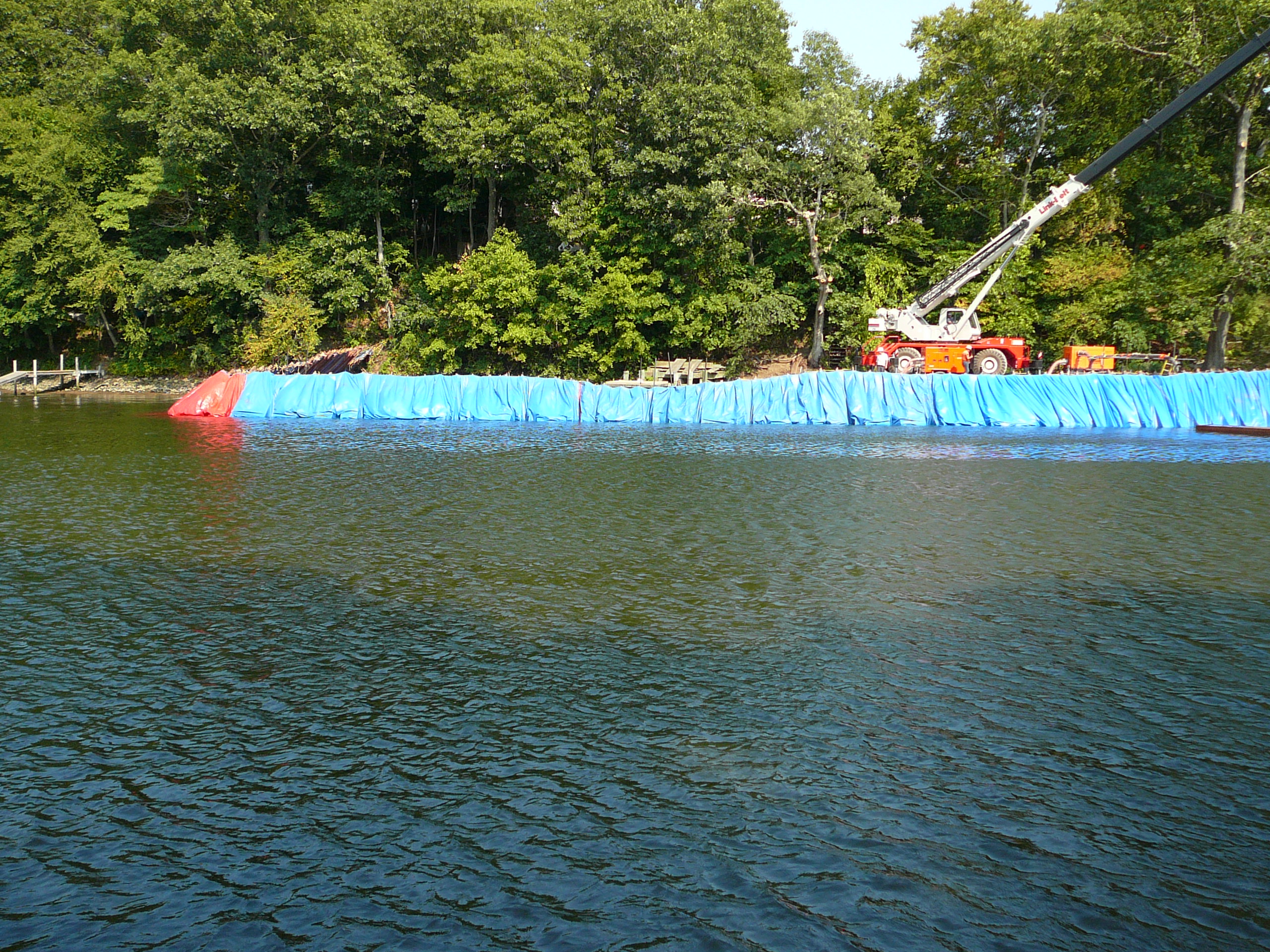 Repair of a leaking 14” cast iron sewer force main located 45’ offshore under the Smith Cove tidal basin by construction of a temporary access road composed of stone and crane mats, installation of a temporary cofferdam utilizing a rough terrain crane, and dewatering of the river utilizing 2-stage well points to access the break.